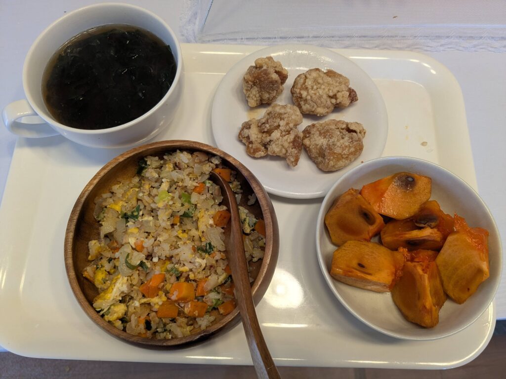 わかめのお味噌汁と、冷凍のから揚げをチンして