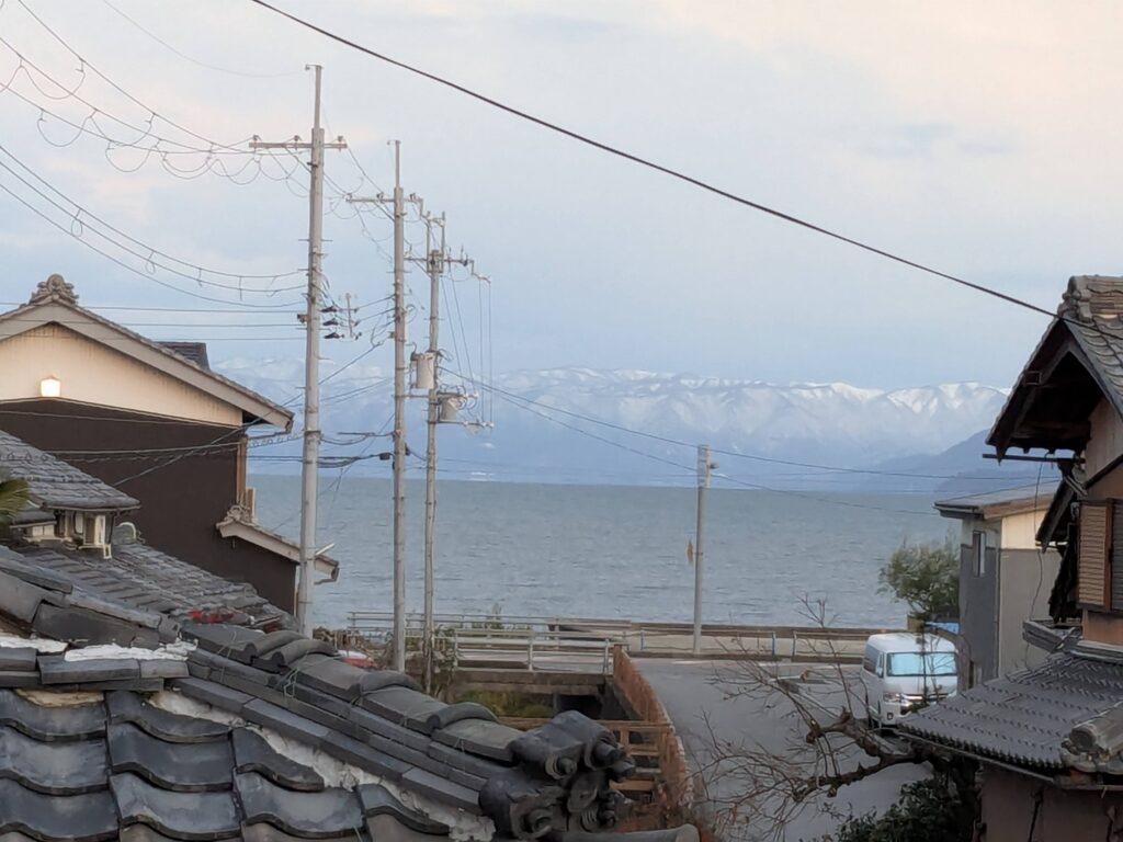 琵琶湖の向こうの山々の雪化粧された山脈が