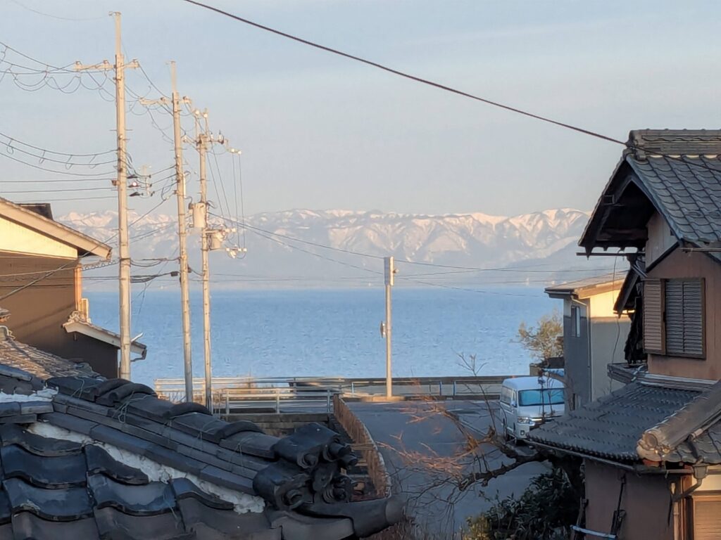 琵琶湖の向こう岸の山々に雪が積もっていて
