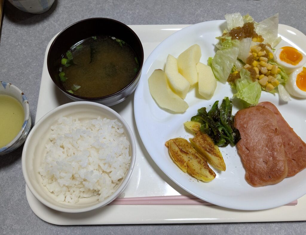 本日の朝食は、お土産で頂いたランチョンミート💖