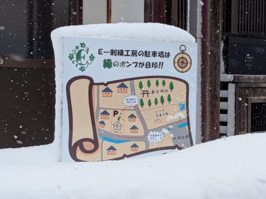 Eー刺繍工房の看板も雪に埋もれていました(笑)