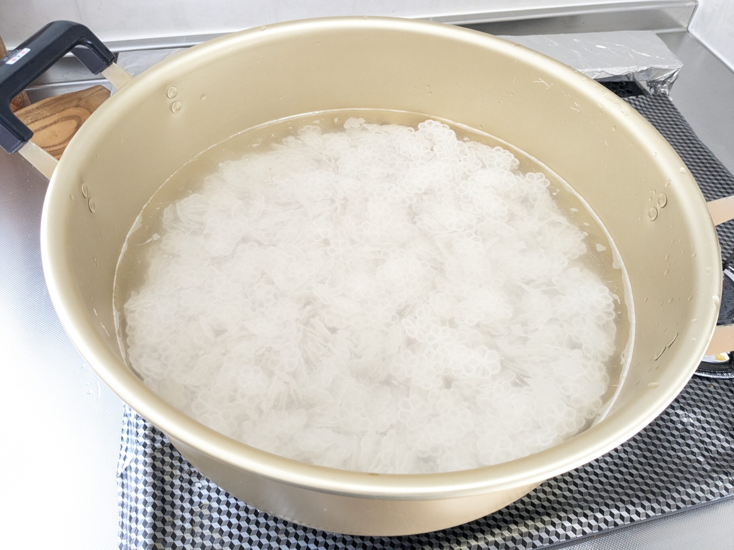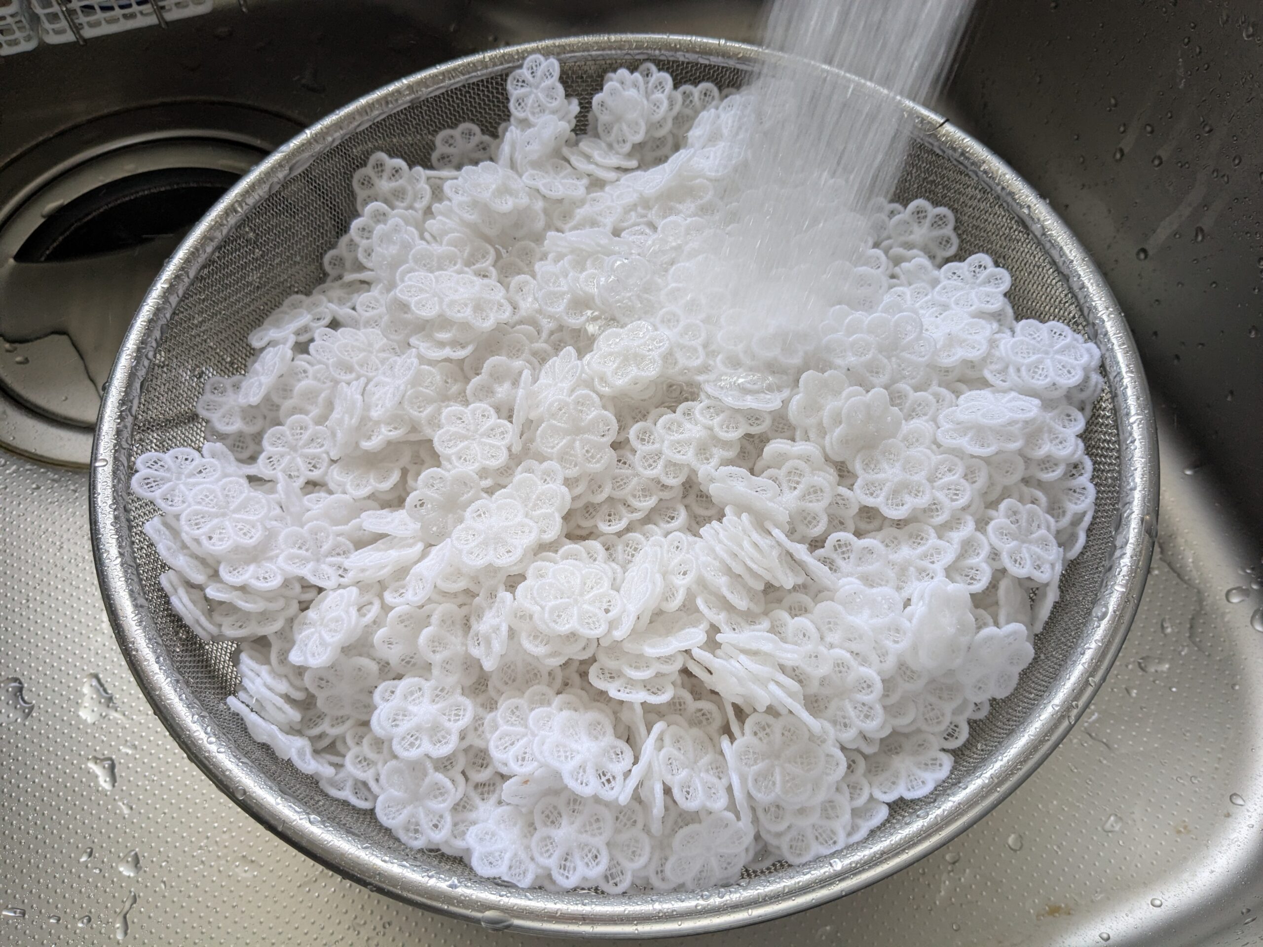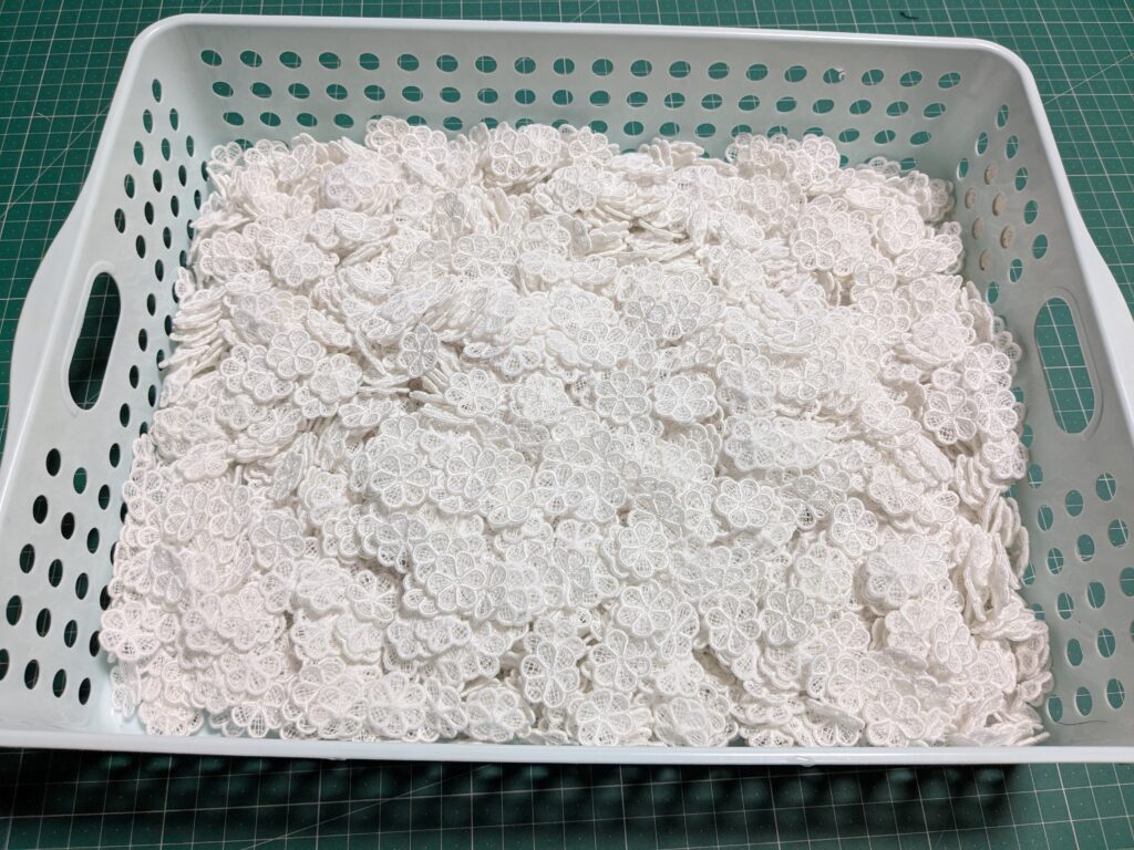 本日の午前中は、お花のモチーフ刺繍の不織布を溶かしました。