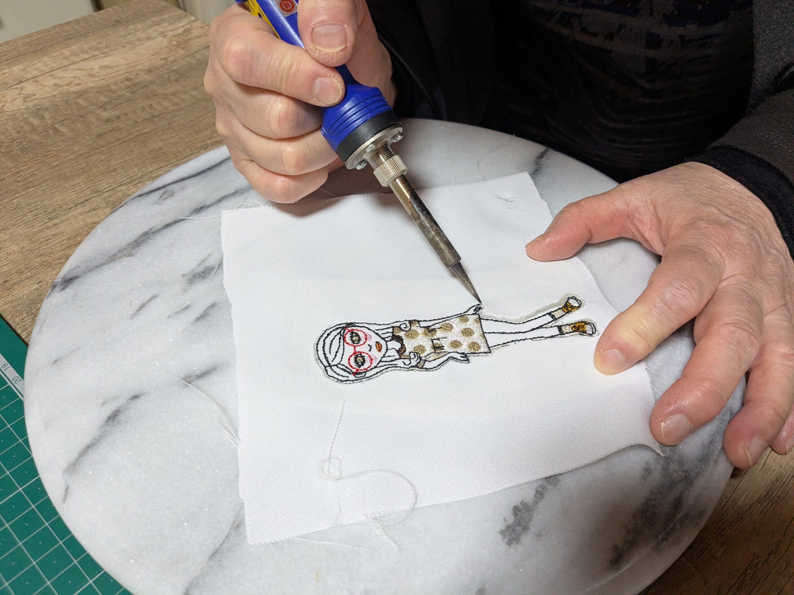 午前中に昨日刺繍したメガネガールの刺繍を